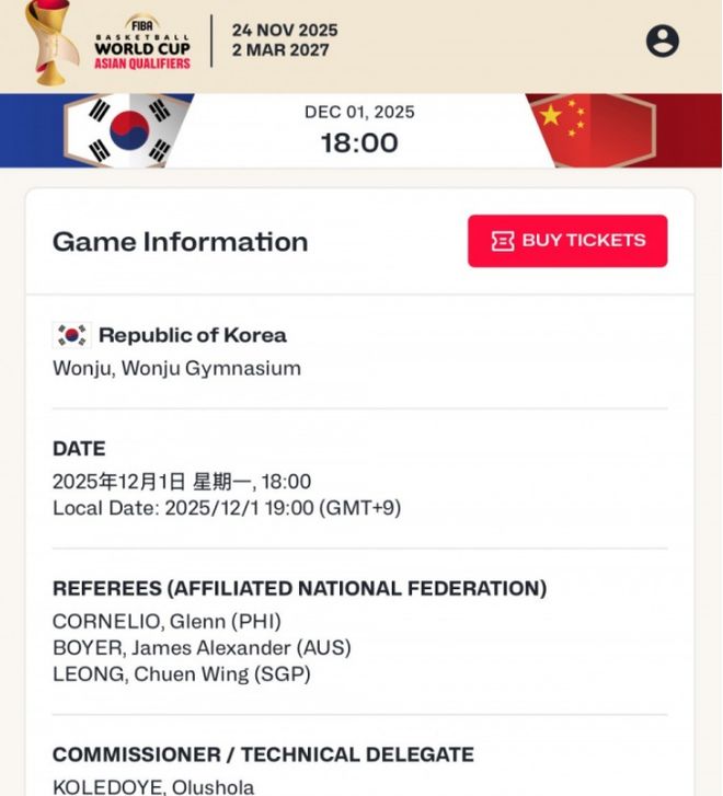 除此之外,根据媒体人球圈赵探长报道,中国男篮与韩国男篮的二番战,3位裁判的安排已经出炉:“明日世预赛中韩二番战裁判来自菲律宾、澳大利亚和新加坡,其中新加坡裁判梁俊容执裁过CBA,官网球员名单暂无变化。”除此之外,中国裁判孙健担任澳新二番战的主裁,两位韩国知名裁判将担任他的副手。(文/醉卧浮生)