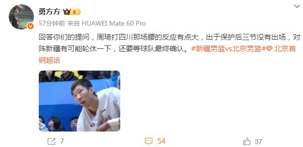 周琦在上一轮早早打卡下班,仅登场7分13秒高效得到9分2篮板1抢断,之后就因为全华班四川不堪一击,让周琦失去登场比赛的机会。对此,媒体人勇方方如今表示:“回答你们的提问,周琦打四川那场腰的反应有点大,出于保护后三节没有出场,对阵新疆有可能轮休一下,还要等球队最终确认。”