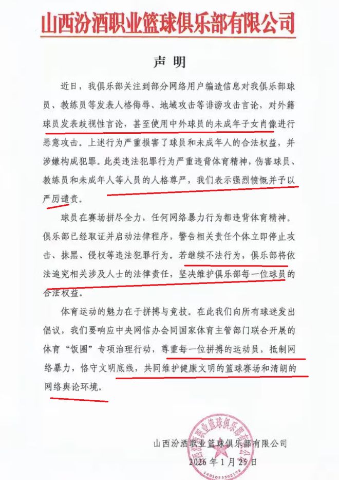 从山西队声明内容显示:俱乐部已经关注到一些网络用户,针对山西队球员、教练员等人,发表了一些地域攻击、人格侮辱等诽谤攻击言论,以及对山西队外援发表了歧视性言论……对于这些言论,山西队表示强烈愤慨,同时,进行严厉谴责。