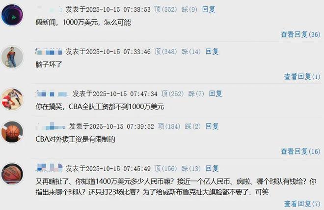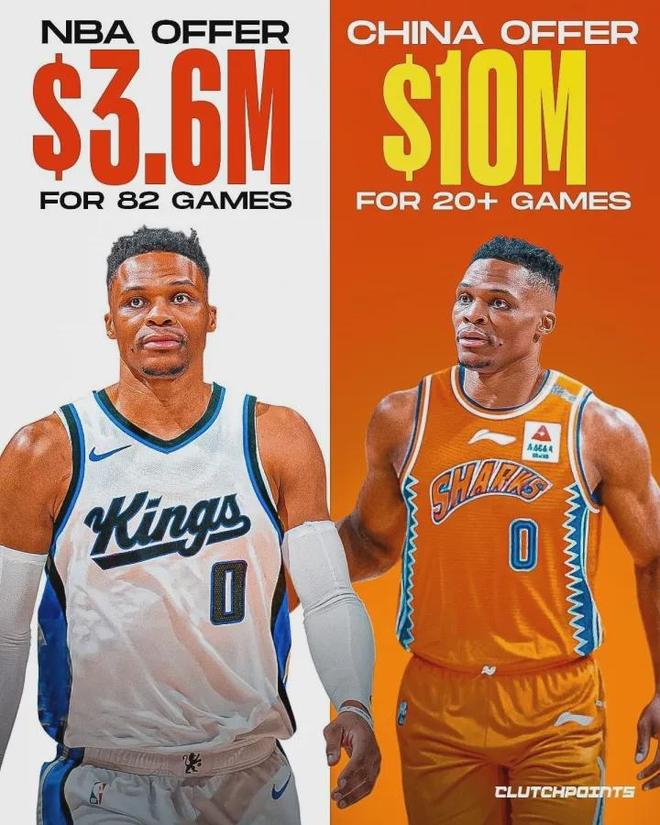 神马?美媒Clutch Points称有CBA球队为威少报价年薪1000万-1400万美元,并且只需打半个赛季,出场数大概23场比赛,若能帮助球队打进季后赛薪资还能继续上涨。CBA新赛季外援工资帽为425万美元,不过可以超出这个范围但需缴纳调节费,相当于NBA的奢侈税。如果超出200万美元以上,调节费比例为150%。好家伙,CBA球队得到威少所付出的代价,可不仅1000万美元出头的年薪,有哪家俱乐部顶得住?怕是壕无人性的上海队都难以承受,再说了有钱不代表可以随意撒钱。对于上述美媒的报道,众多网友对此表示质疑,如下:其实无论CBA或其他联赛开价多少,对于生涯至今总薪资收入高达3.46亿美元的威少来说都是九牛一毛,且人家当前最主要目标还是重返NBA甚至压根没有前往海外打球的想法。据最新的威少新下家赔率显示,国王、火箭、独行侠、勇士和尼克斯分别前四,没有一家CBA队伍在列。