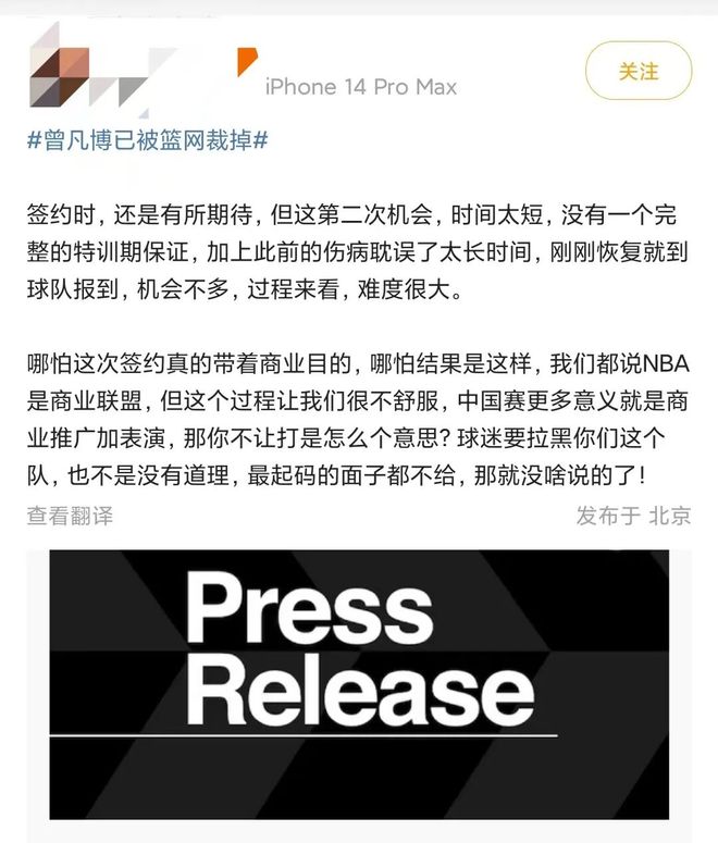 说句实话,看到曾凡博被篮网裁掉的消息,应该很多人心里都不是滋味。有人会说这是早就能猜到事情,毫无意外;但我想说,曾凡博这一趟,不应该是白走的。在刚刚结束的两场NBA中国赛中,曾凡博总共出场10分钟,没有得分,也没有什么高光镜头。对于这位年轻人来说,这10分钟,可能就是一整个夏天的意义所在了。被裁之后,工作室也在第一时间发了声明:“感谢所有球迷的支持,能穿上NBA的球衣站上赛场,本身就是一种骄傲。接下来,小曾会回到美国专注恢复,并评估接下来的计划。”
