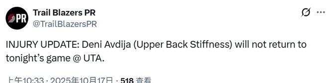 开拓者官方:阿夫迪亚因上背部僵硬本场比赛不会回归