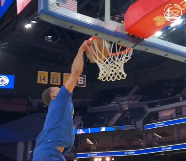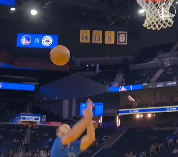 雷速体育10月18日讯 NBA季前赛继续进行,勇士将在今天的季前赛收官战中主场迎战快船。赛前热身环节,库里展示花活儿。