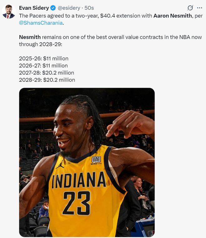 埃文-斯迪瑞也晒出了内史密斯的合同细节:25-26赛季1100万、26-27赛季1100万、27-28赛季2020万、28-29赛季2020万,他未来四年的薪水仅为6240万,均薪为1560万,对于这样的顶级3D来说步行者赢麻了。