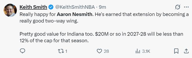 肯尼-史密斯表示:真的为内史密斯感到感谢,他值得这笔续约合同,对于步行者来说这次续约也极具性价比,27-28赛季大约2000万连该赛季工资帽的12%都不到。