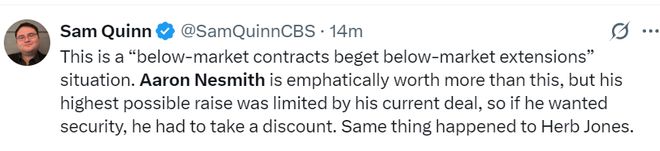 CBS记者萨姆-奎因评价内史密斯这笔续约:这种明显低于市场价的续约情况,阿龙-内史密斯的价值远远高于他跟步行者签下的两年4040万,但根据他现有的合同条款,他所能获得最大的加薪限度是有限的(低于工资帽12%),所以要保障自己的利益就只能接受一定的折扣。鹈鹕的赫伯特-琼斯也是类似的情况。