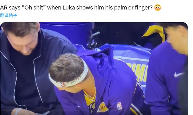 雷速体育10月28日讯 NBA常规赛继续进行,湖人今天在主场迎战开拓者。东契奇因为左手手指扭伤和小腿挫伤缺席本场比赛,在替补席上东契奇给里夫斯展示他受伤的手指。里夫斯看后惊呼:“卧艹!”