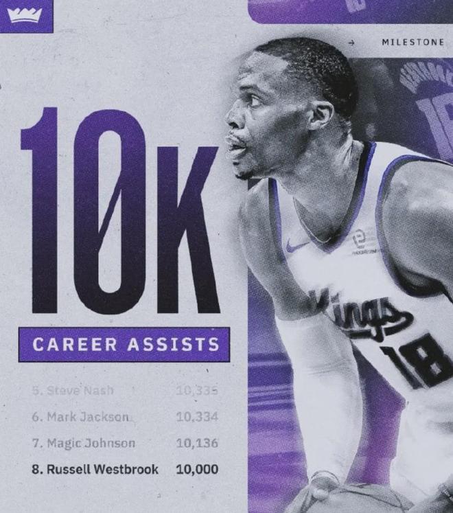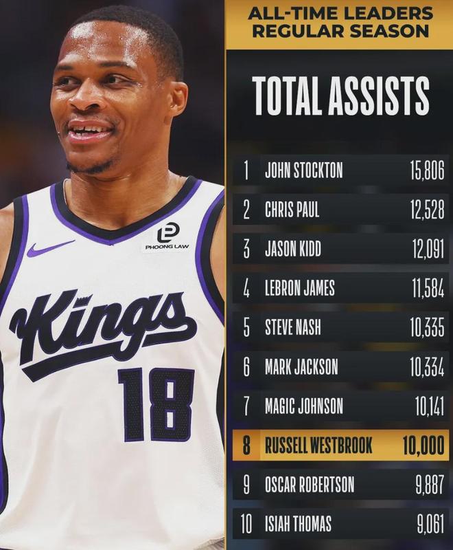更为重要的是,威少爷又达到了自己的一个里程碑。在比赛的第三节,威少爷送出了个人本场第7次助攻,至此他的NBA生涯总助攻数突破了10000次,升上NBA历史助攻榜第8位。
