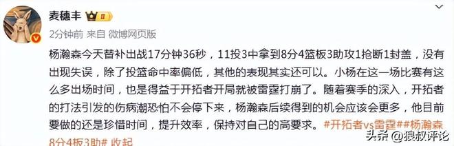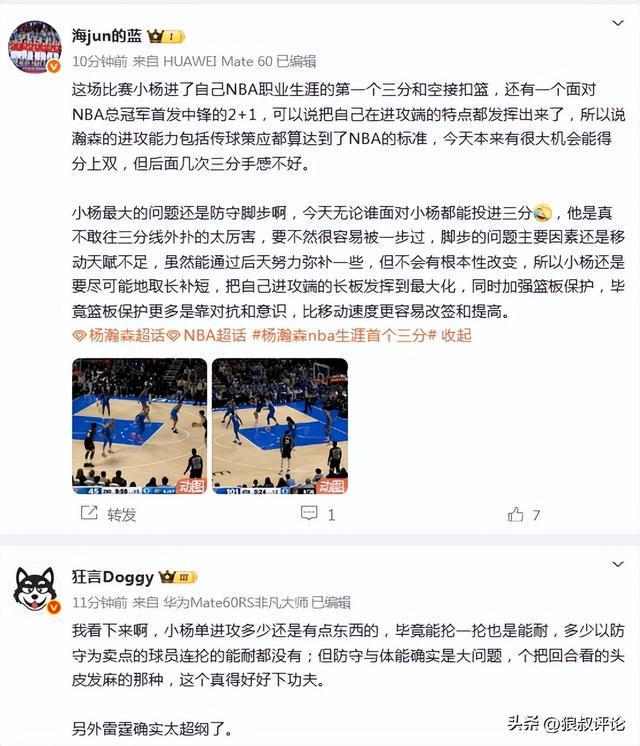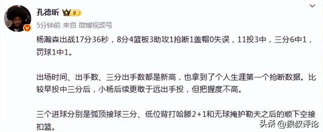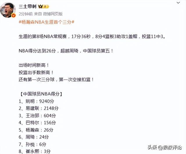 北京时间11月24日,开拓者95-122不敌雷霆。后者取得新赛季的9连胜。本场比赛,中国球员杨瀚森登场17分钟,11投3中,贡献8分4篮板3助攻1抢断1盖帽,命中NBA生涯首个三分球。赛后,杨瀚森的表现引发球迷和媒体的热议。 媒体人“三土带刺”发文点评:NBA得分达到26分,超越周琦,中国球员第五!出场时间新高!投篮出手数新高!还有第一次三分球,第一次空接扣篮!【中国球员NBA得分】1、姚明:9240分2、易建联:2148分3、王治郅:604分4、巴特尔:156分5、杨瀚森:26分6、周琦:24分7、孙悦:6分8、崔永熙:3分 媒体人“麦穗丰”发文点评:杨瀚森今天替补出战17分钟36秒,11投3中拿到8分4篮板3助攻1抢断1封盖,没有出现失误,除了投篮命中率偏低,其他的表现其实还可以。小杨在这一场比赛有这么多出场时间,也是得益于开拓者开局就被雷霆打崩了。随着赛季的深入,开拓者的打法引发的伤病潮恐怕不会停下来,杨瀚森后续得到的机会应该会更多,他目前要做的还是珍惜时间,提升效率,保持对自己的高要求。 篮球记者“孔德昕”发文点评:“出场时间、出手数、三分出手数都是新高,也拿到了个人生涯第一个抢断数据。比较早投中三分后,小杨后续更敢于远出手投,但把握度不高。三个进球分别是弧顶接球三分、低位背打哈滕2+1和无球掩护勒夫之后的顺下空接扣篮。” 媒体人赵探长发文点评:“杨瀚森今天得到8分4篮板3助攻1抢断1盖帽,NBA生涯总得分来到26分,超越周琦排名中国球员第五,他前面是156分的巴特尔。” 媒体人“海JUN的蓝”发文点评:这场比赛小杨进了自己NBA职业生涯的第一个三分和空接扣篮,还有一个面对NBA总冠军首发中锋的2+1,可以说把自己在进攻端的特点都发挥出来了,所以说瀚森的进攻能力包括传球策应都算达到了NBA的标准,今天本来有很大机会能得分上双,但后面几次三分手感不好。小杨最大的问题还是防守脚步啊,今天无论谁面对小杨都能投进三分[允悲],他是真不敢往三分线外扑的太厉害,要不然很容易被一步过,脚步的问题主要因素还是移动天赋不足,虽然能通过后天努力弥补一些,但不会有根本性改变,所以小杨还是要尽可能地取长补短,把自己进攻端的长板发挥到最大化,同时加强篮板保护,毕竟篮板保护更多是靠对抗和意识,比移动速度更容易改善和提高。