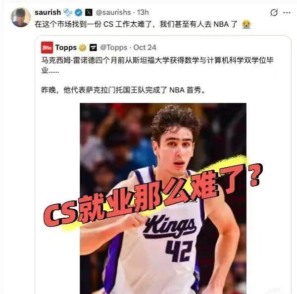 雷诺和他的家人希望能够学业篮球两手抓的原因很简单,一方面是如果有能力兼顾,为什么不去尝试?另一方面,雷诺一直以来都不是什么热门新秀,他在大学打满四年也是因为没有被选上的把握,在淘汰率极高的篮球世界,成为一个运动员的收入还未必比得上拿着文凭上班的薪酬。国王和雷诺签订的是一份3年590万、第三年球队选项的合同,保障金额为342万美金,看天眼来看,这份收入对于任何球员来说都不是小数目,但假如雷诺未能被选中,如果拿着双向合同拼搏多年后回到欧洲的篮球联盟,他的收入数字不会好看。以法国LNB Pro A联赛为例,球员的平均年薪不到20万美金,而斯坦福的毕业生起薪中位数一般在10万美元左右,10年工龄的年薪中位数在17.8万,而雷诺所读专业对应的行业将会有高出平均线的薪资,在不具备明显的NBA前景之下,雷诺面对的可能是“上班比打球更赚钱”的生活,他本人想要到NASA工作的言论绝不只是随口一说。跟超级体育生+高材生的爽文标签相比,雷诺更出圈还是他和文班亚马下国际象棋的图片。“少林武僧”文班亚马是个爱体验各种项目的年轻人,他不仅跟Espoirs Nanterre俱乐部青年队、国青的队友雷诺下棋,还被拍到跑去纽约的公园里找老大爷下棋,只是两人的水平就是入门选手和资深玩家的差别。