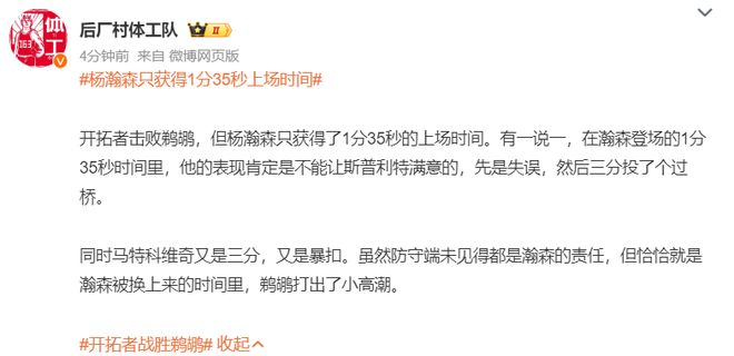 后厂村体工队评价:杨瀚森只打1分35秒,有一说一他登场的时间是无法让斯普利特满意的,先是失误然后投了一个三分过桥,玛特科维奇又是三分又是暴扣,杨瀚森一上来鹈鹕就一波小高潮。
