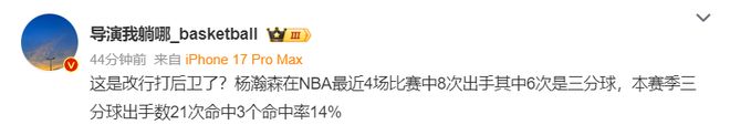 导演:杨瀚森这是改打后卫了?过去的四场比赛10个出手有6个是三分球(也只命中两个三分球,没有任何一个两分球命中),本赛季三分球出手21次命中3个,三分球命中率仅14.3%。