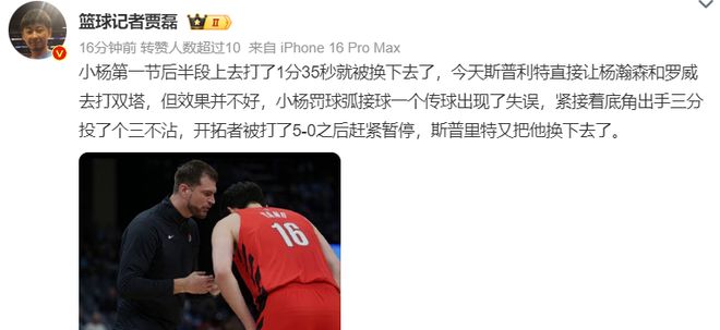 北京时间1月3日,开拓者122-109大胜鹈鹕避免连败。这场比赛中国球员杨瀚森继续获得登场机会,他已经连续四场比赛被斯普利特纳入轮换,只可惜此役他只有1分35秒,而此前的三场比赛都有至少10分钟。