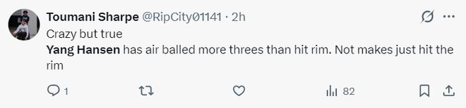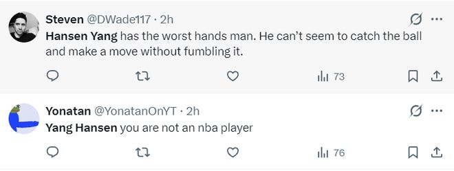 美球迷:杨瀚森是队内传球能力最差的,他就连接球并顺利传球都困难,很多次都是失误;杨瀚森就不是一个NBA级别的球员。
