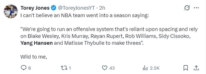 NBA记者特雷-琼斯,我简直不理解有NBA球队会说依靠韦斯利、克里斯穆雷、罗威、西索科、杨瀚森、塞布尔这样的阵容来投三分球,这完全是疯狂的说法。