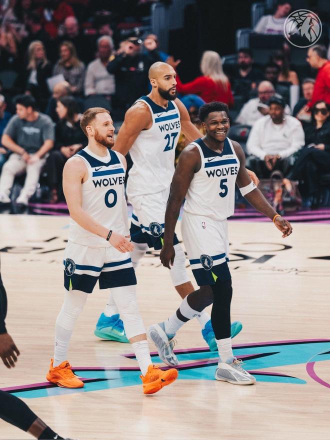 森林狼队,里德15中10,三分球7中4狂砍29分4板3助2帽、兰德尔17中10高效的砍下了23分10板4助、戈贝尔7中5贡献了13分12板1助、迪文岑佐13中5,三分球8中1得到11分8板4助2断、麦克丹尼尔斯5分2板3助2断2帽、康利5分1板3助、海兰德4分3助、克拉克2分。