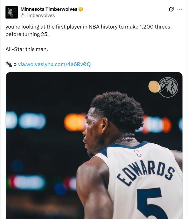 需要关注的是,爱德华兹在此役还创下了NBA历史第1的神迹。森林狼官方更新数据显示,此战之后,爱德华兹的三分命中数突破1200记,25岁以前NBA首人。