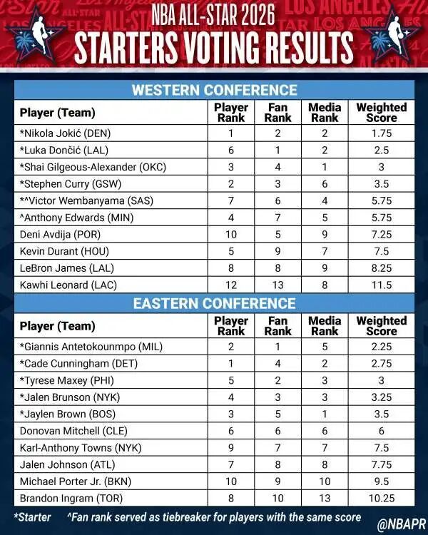 今年的NBA首发阵容出炉了
