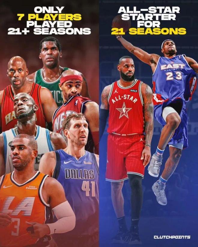 自此之后,詹姆斯连续21年全明星首发,你要知道历史上只有7个人打了超过21个NBA赛季
