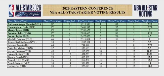 特别是在最近结束的全明星投票环节,虽然在球迷投票环节他的票数247万仅位列东部第5,但在球员互投环节他获得138张选票,在东部所有球员中排名第3,仅低于坎宁安的159票和字母哥的147票,而在更有含金量的篮球记者、评论员投票环节,布朗获得98张首轮票,在东部球员中高居第1,最终综合评分3.5分,职业生涯首次入选全明星首发,他的担当表现收获了一致认可.