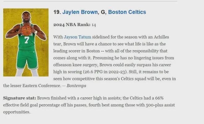 杰伦-布朗一直受到一定程度的低估,他在超顶薪续约时、获得总决赛MVP时都有许多反对质疑声音,而且凯尔特人管理层也确实曾认真考虑过关于杰伦-布朗的交易方案,在赛季初ESPM评选的2025-26NBA百大球星中,布朗仅位列第19位,网站评语如下:由于塔图姆跟腱撕裂赛季报销,布朗将体验波士顿凯尔特人队头号得分手的生活—以及随之而来的所有责任,假设他没有受到休赛期膝盖手术的后续影响,那他很有可能超越职业生涯最高的场均得分(2022-23赛季26.6分),不过即便身处实力相对较弱的东部联盟,以目前凯尔特人队的竞争力究竟有何表现仍有待观察.